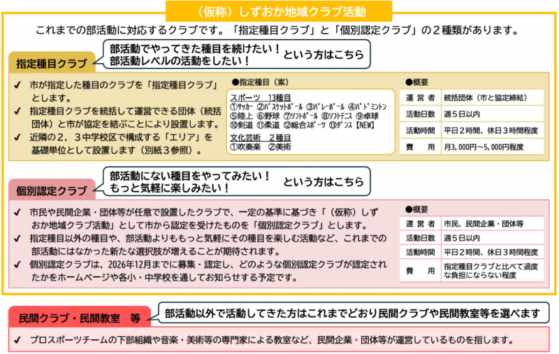 静岡市の場合、R9年夏を以て学校部活動はすべて終了(消滅)の予定です。現在改革は行政対応となっており、市長もTVニュースで明言しているので、おそらく変更はない。2025年現在、小学6.5年生が直接的な影響を受けます。部活終了を迎えれば、そのまま「地域クラブ」に移るか「クラブチーム」へ移籍か、「やめて無所属」かの3択なのでしょうね。次に地域クラブの活動内容の具体を少々説明。