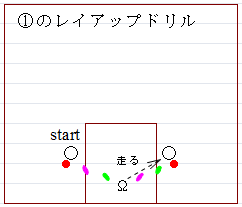②レイバックを2~3歩のステップで、左右交互連続10本。ゴール横方向に立ち、ベースラインに平行に動く。できるだけ無駄足を踏まず、連続的にシュートする。