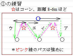 ④上の③同様、スモールコートで長めに走るのだが、ボールが飛んできた方向と逆へ返球する、スリーメンパス型のドリル。
